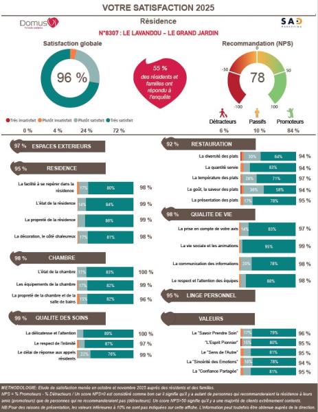 Nous avons le plaisir de partager que nous avons obtenu un taux de satisfaction global de 96 %, un résultat qui témoigne de l'engagement de nos équipes et de la qualité des services que nous mettons à disposition au quotidien. En parallèle, notre NPS (Net Promoter Score) atteint 78, un indicateur qui reflète le haut degré de confiance et de satisfaction de nos résidents et de leurs familles.