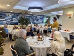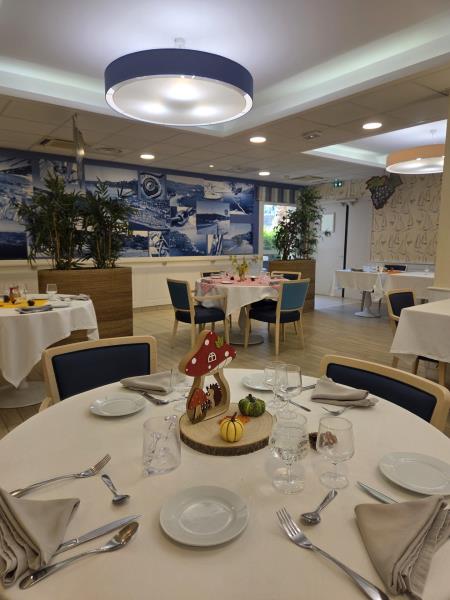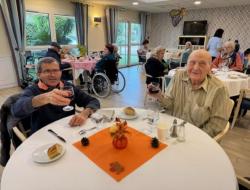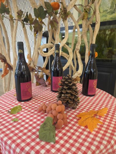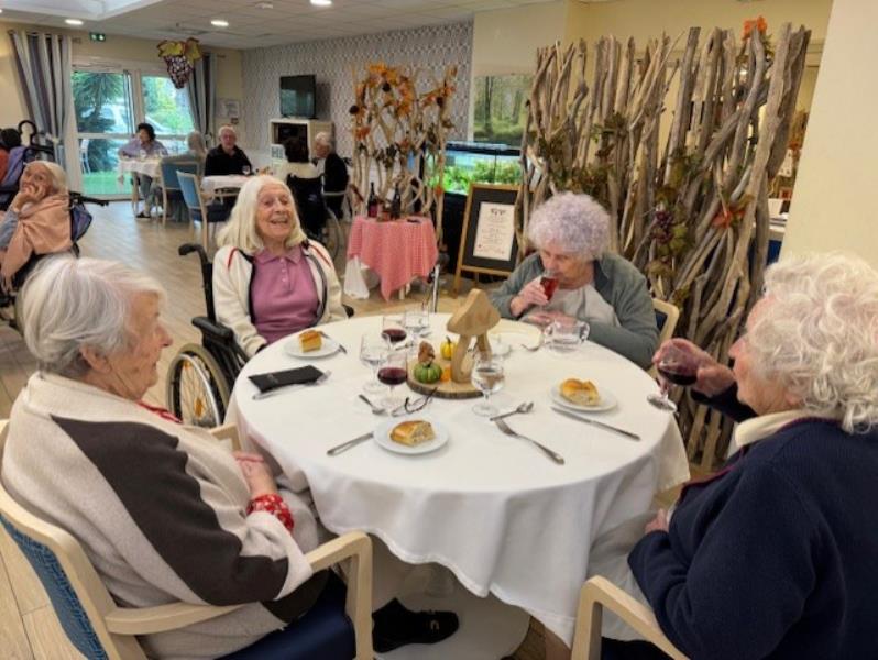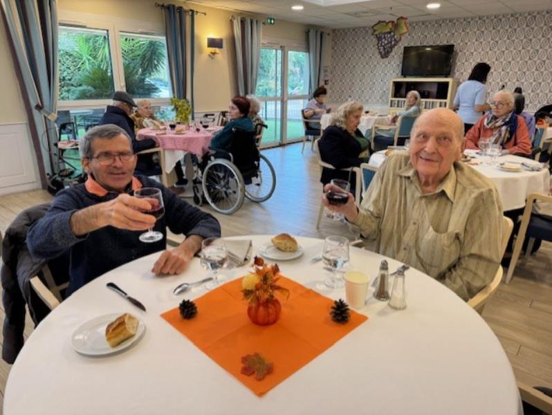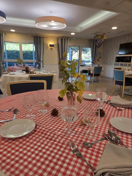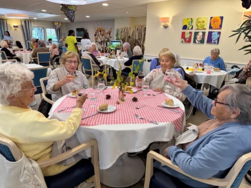 Pour l’occasion, notre animateur avait transformé les salles de restaurant : décorations chaleureuses, couleurs d’automne et ambiance festive… tout était réuni pour faire voyager nos résidents au cœur des vignobles.