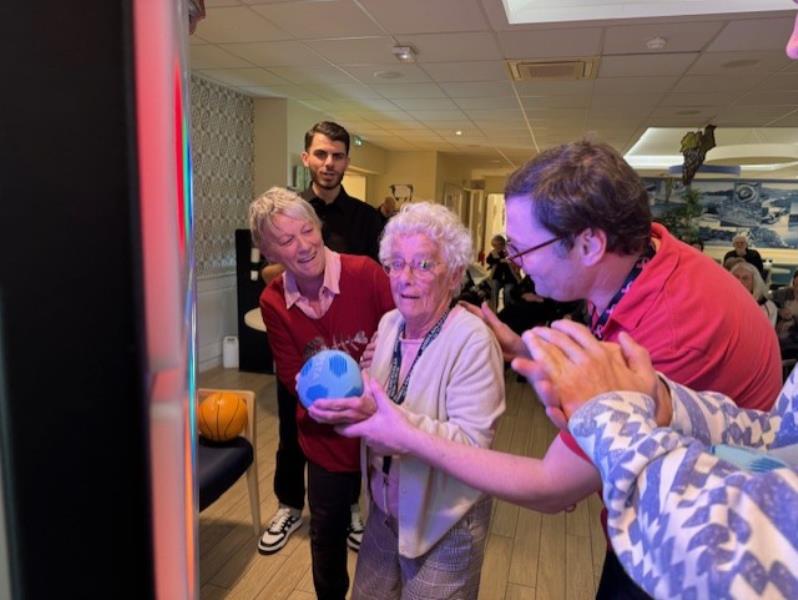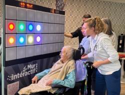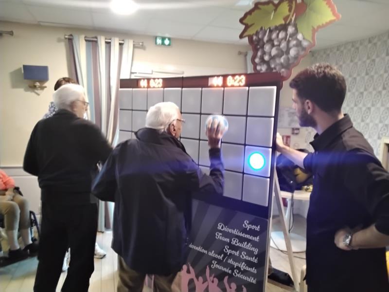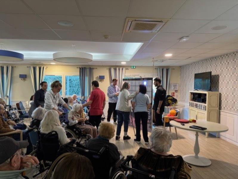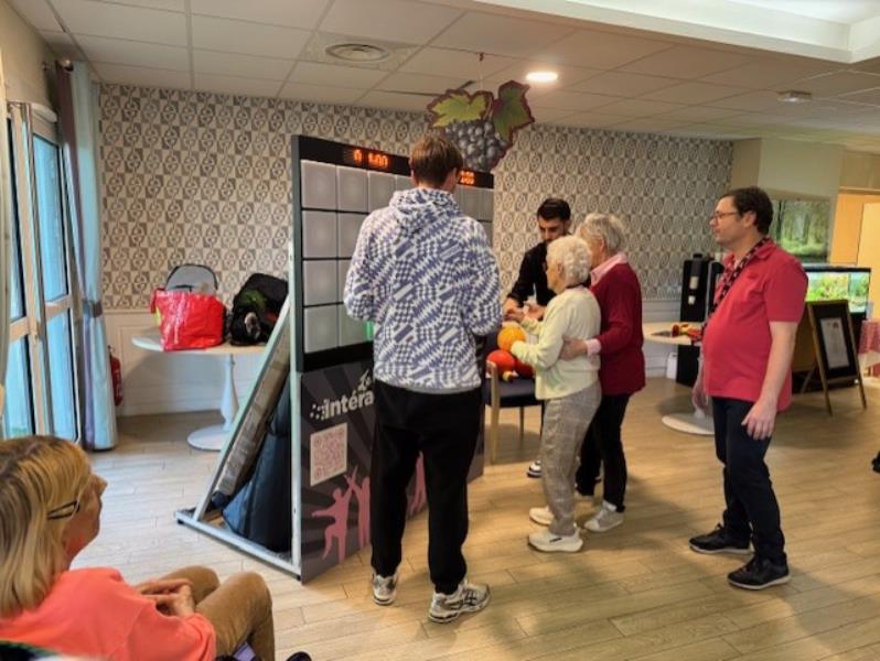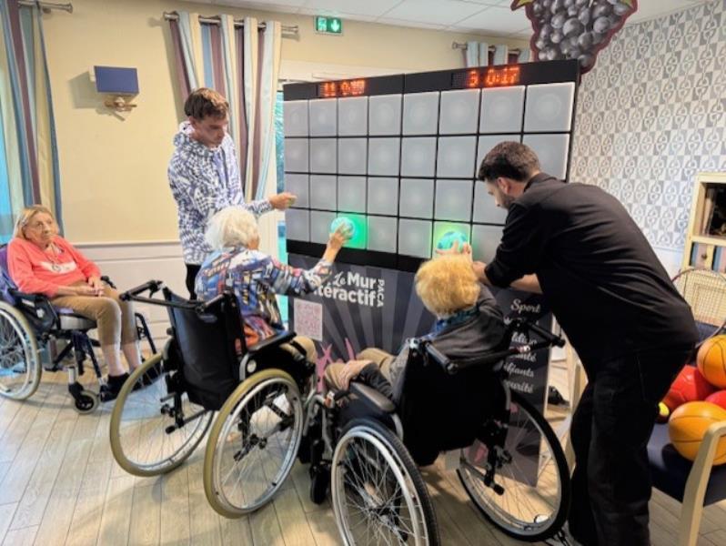 Dans cette démarche d’innovation, nous avons accueilli les représentants régionaux du mur interactif, une technologie mêlant réalité virtuelle et interaction physique. Résidents, proches et équipes ont découvert cette activité avec beaucoup de curiosité et de bonne humeur.