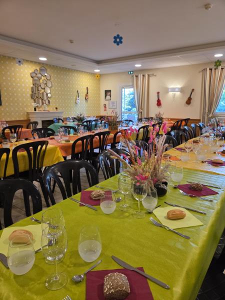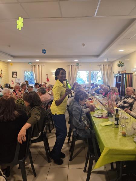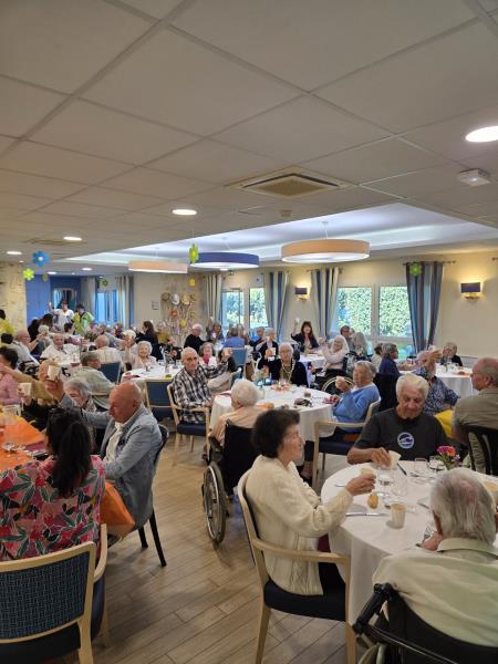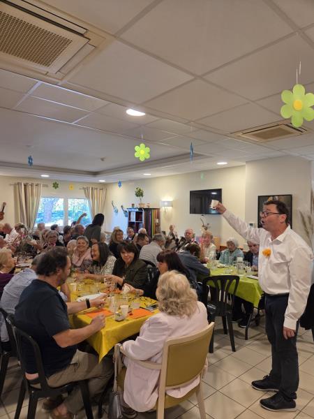 Même si le mistral s’est invité à la fête, rien n’a pu entamer la joie de cette journée ! Nos équipes ont tout simplement déplacé les festivités dans nos salons et notre grand restaurant, joliment décorés pour l’occasion, où les tables colorées et festives, préparées avec l’aide précieuse de nos résidents, ont accueilli près de 160 convives.